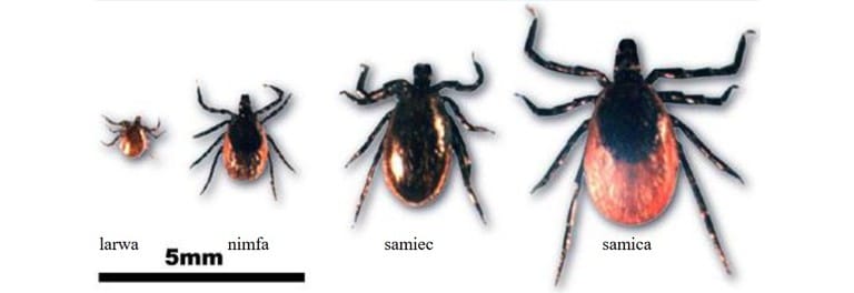 Kleszcz ma 8 odnóży (larwa – 6), a jego aparat gębowy działa jak maleńka kotwica, która mocno wbija się w skórę psa. Warto wiedzieć, jak wygląda kleszcz, by móc go szybko zauważyć i bezpiecznie usunąć – zanim zdąży wyrządzić psu krzywdę, dlatego poniższe zamieszczam grafikę z rozróżnieniem na wszystkie etapy rozwojowe kleszcza pospolitego.